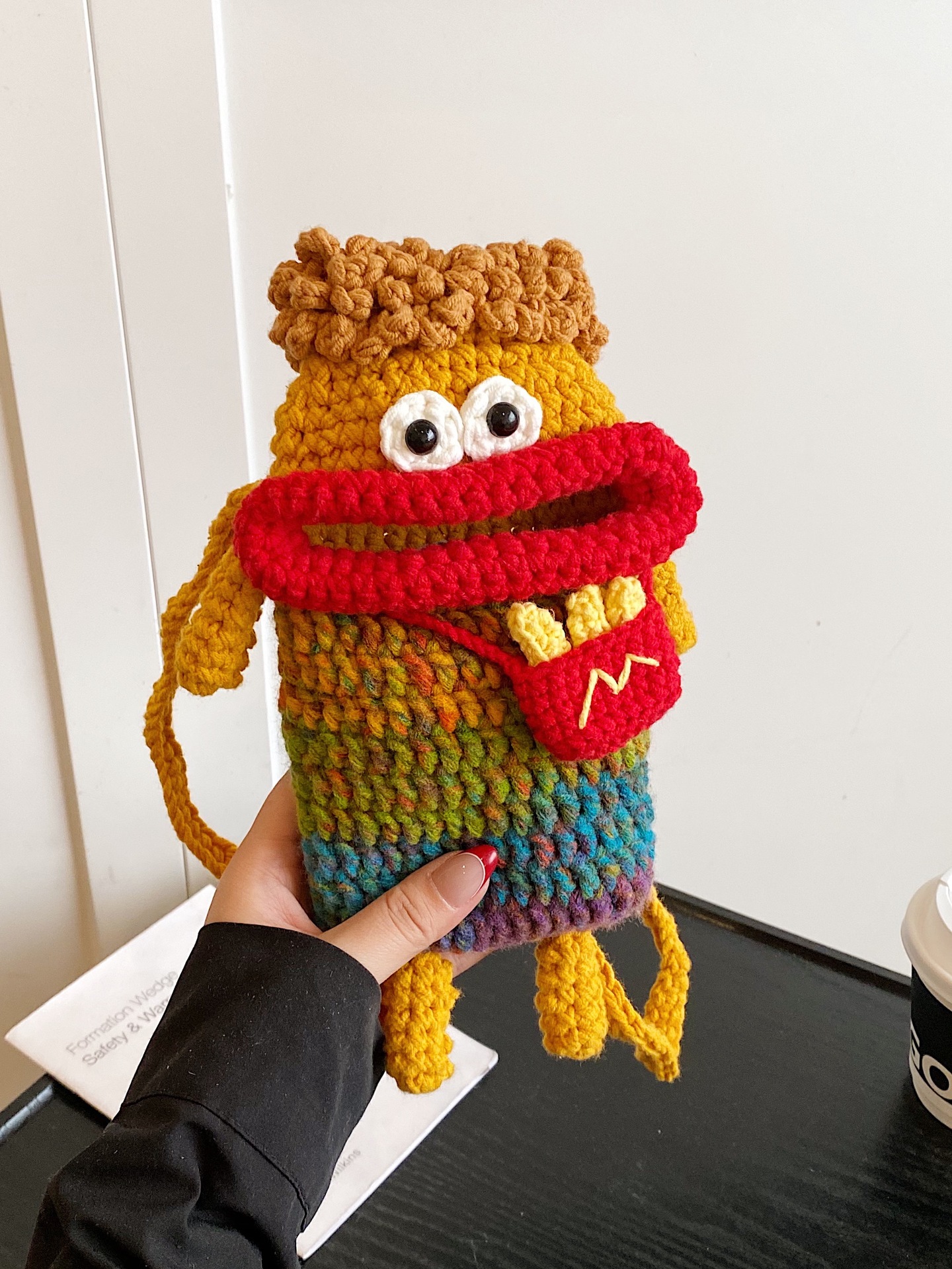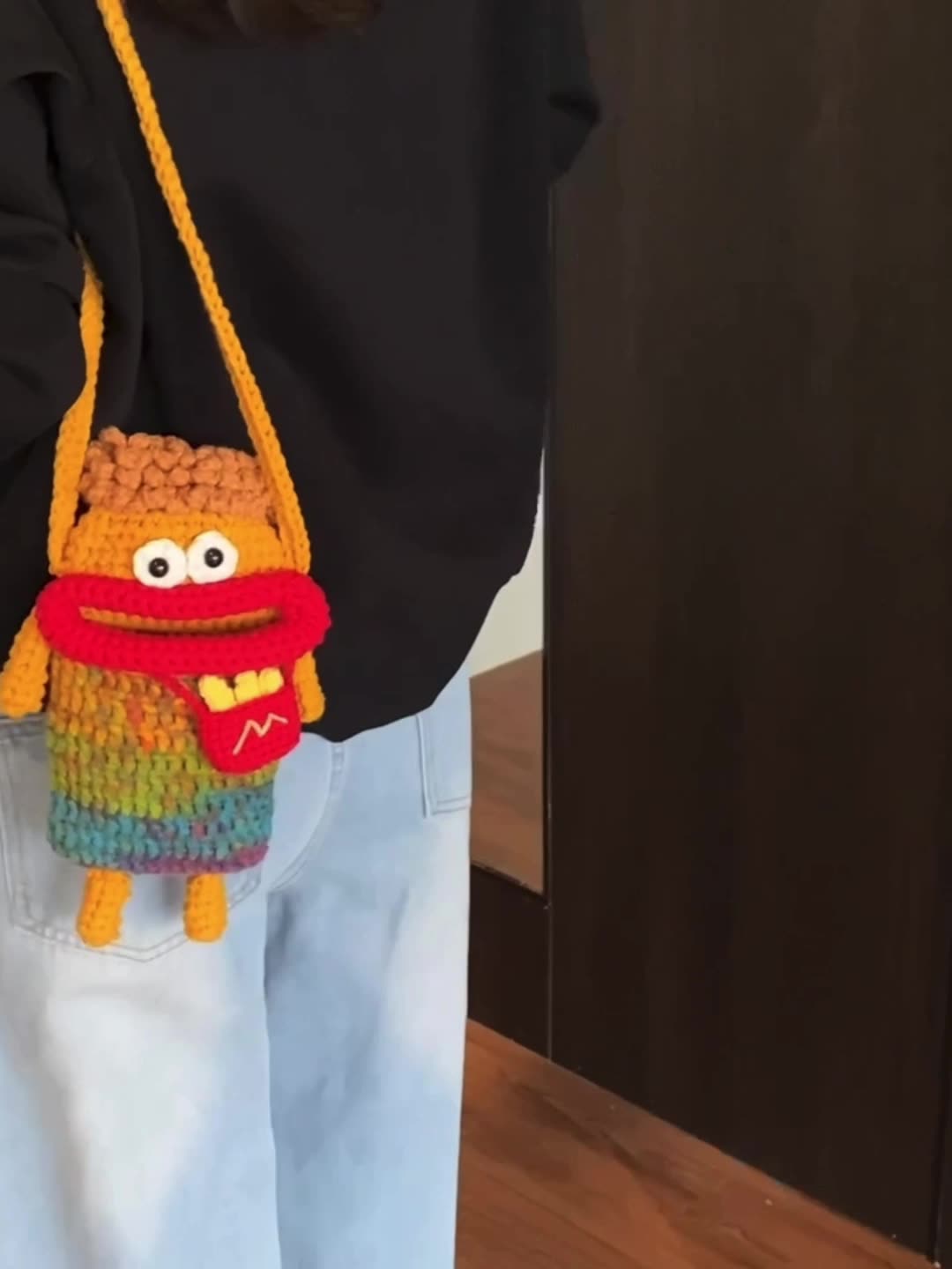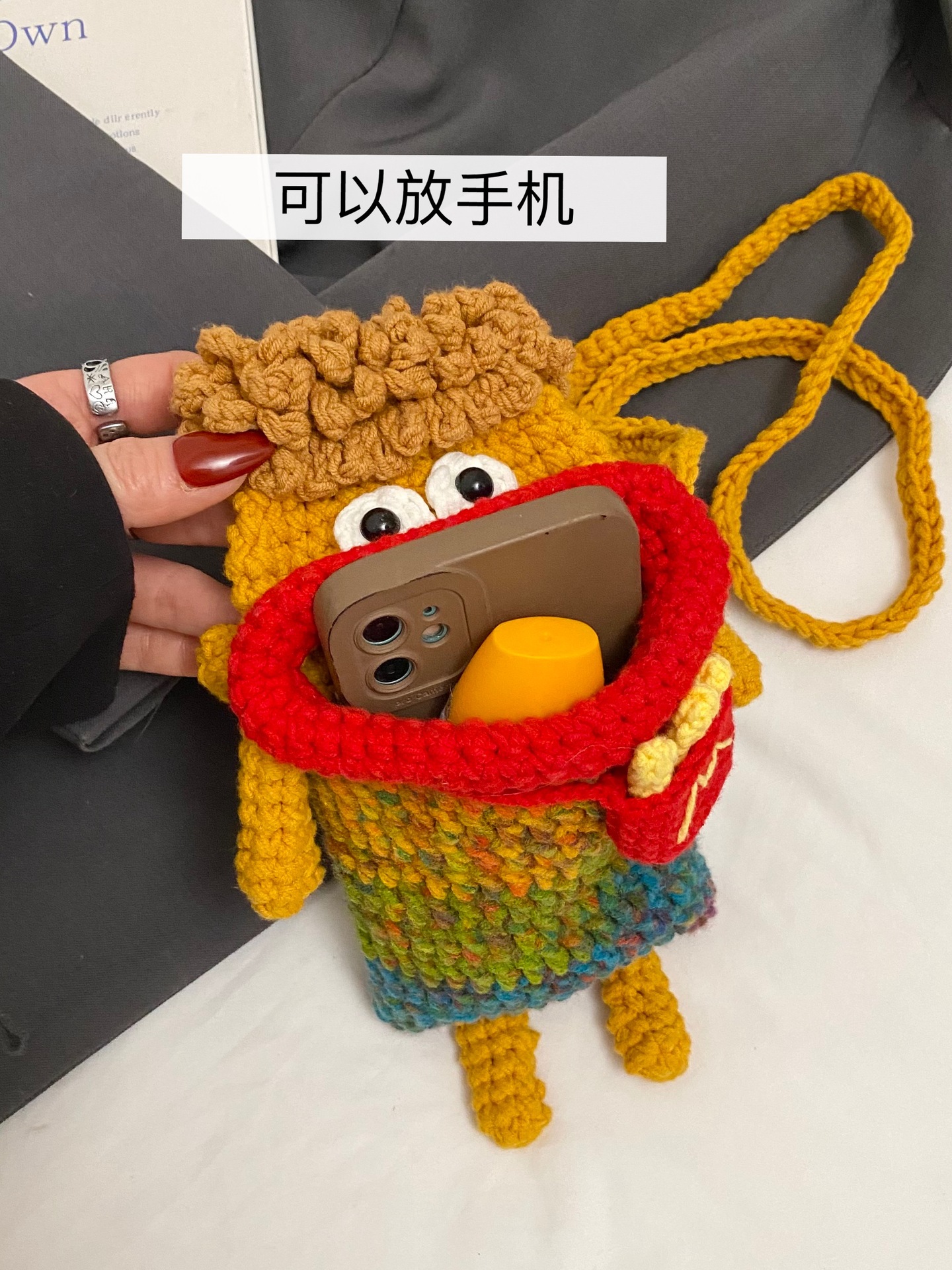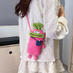 Wolle Häkelwurst Mund Mobiltelefon Tasche mit handgewebten hässlichen süßen Crossbody-Tasche Frauenbeutel Kindermünzen Brieftasche